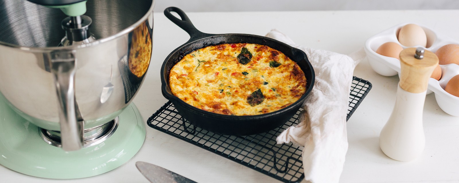 Laissez cuire pendant 8 à 10 minutes à feu doux. Mettez la poêle au four et faites cuire sous le grill à 220 °C pendant 8 minutes ou jusqu’à ce que la frittata soit dorée et ferme.