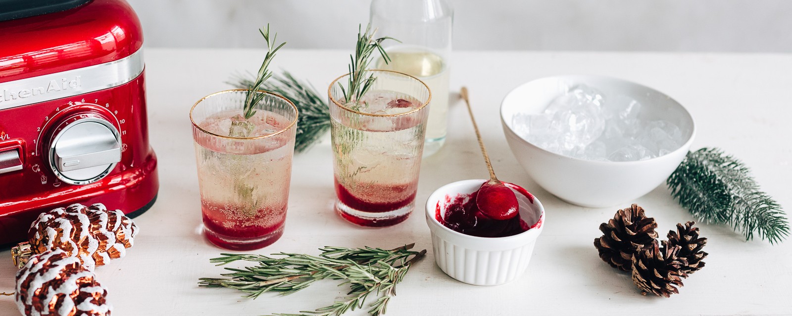 Ajoutez une cuillère à soupe de coulis de canneberge dans chaque verre, puis ajoutez les glaçons et l’eau pétillante à la fleur de sureau. Servez avec une branche de romarin.