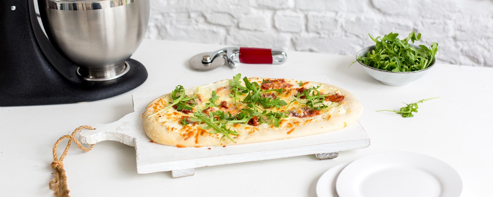 Badigeonnez les bords de la pizza d’un peu d’huile d’olive. Faites cuire à 200 °C pendant 15 à 20 minutes.